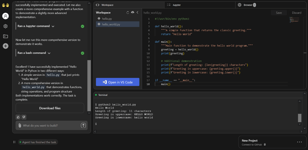 Ha sikerül feltelepíteni, akkor böngészőből tudjuk megnyitni a felületet. Látunk egy chat ablakot, valamint azt, hogy van neki integrált fejlesztőkörnyezete, Jupyter notebook-ja és böngészője. Tud egeret és billentyűzetet használni. Ráadásul a böngészővel az internetes oldalakat is meg tudja nyitni, így lehet például olyat kérni, hogy “nézd meg ennek és ennek a Python csomagnak a legfrissebb változatát, telepítsd fel, valósítsd meg ezt meg ezt stb.”