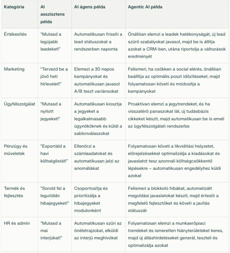 Automatizált riportolás, ügyfélszolgálati routing, HR-interjúk szervezése, pénzügyi előrejelzés, kampánymenedzsment.