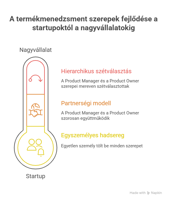 A Product Manager és Product Owner szerepkörök viszonya drasztikusan változik a szervezet méretétől és érettségétől függően. Ami működik egy startupnál, az katasztrófához vezethet egy multinacionális banknál, és fordítva.