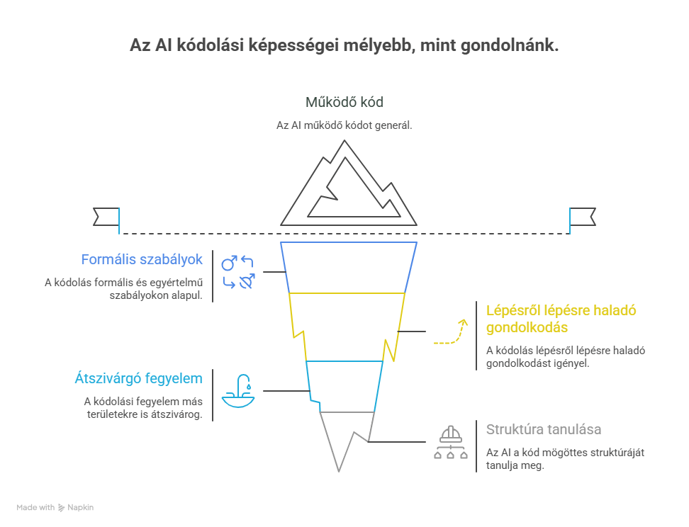 De van itt valami még meglepőbb. Egy 2024-es, az ICLR konferencián publikált kutatás (az egyik legrangosabb MI-konferencia) kimutatta, hogy ha egy nyelvi modellt programkódon tanítanak, az nem csak programozásban lesz jobb – hanem általánosan jobban gondolkodik. Matematikai feladatokban, logikai következtetésben, még szöveges érvelésben is javulást mértek. A kutatók szerint ennek az az oka, hogy a kód természeténél fogva lépésről lépésre haladó gondolkodást igényel: ha egy programban kihagysz egy lépést, nem működik. Ez a fegyelem „átszivárog” más területekre is.